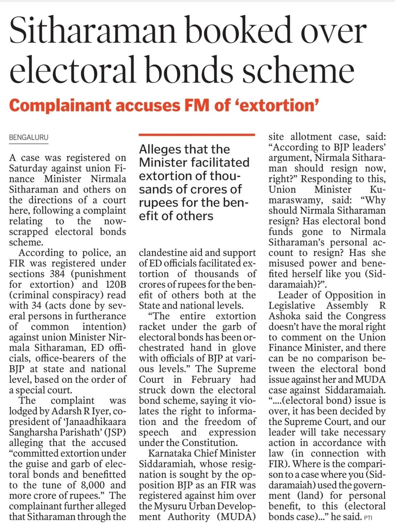 A special court in Bengaluru has directed the police to register a FIR against Finance Minister Nirmala Sitharaman allegedly for ‘extortion’ using electoral bonds. The Supreme Court annulled electoral bonds scheme earlier this year calling it unconstitutional and it violated principles of RTI.
