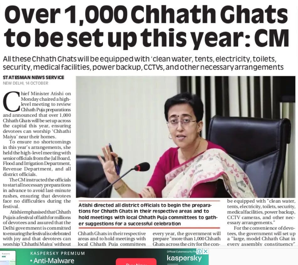Over 1000 Chhath Ghats are to be set up this year. All these Ghats will be equipped with clean water, tents, electricity, toilets, security, medical facilities, power backup, CCTVs and other necessary arrangements.: Atishi