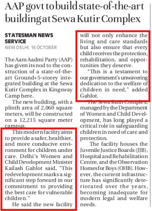 The Aam Aadmi Party government has approved a Ground+5-storey integrated building at the Sewa Kutir Complex in Kingsway Camp, covering 2,060 square meters on a 12,215 square meter campus.