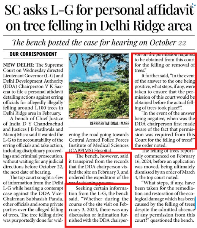 The Supreme Court asks L-G for a personal affidavit on tree felling in the Delhi Ridge area The bench posted the case for hearing on October 22