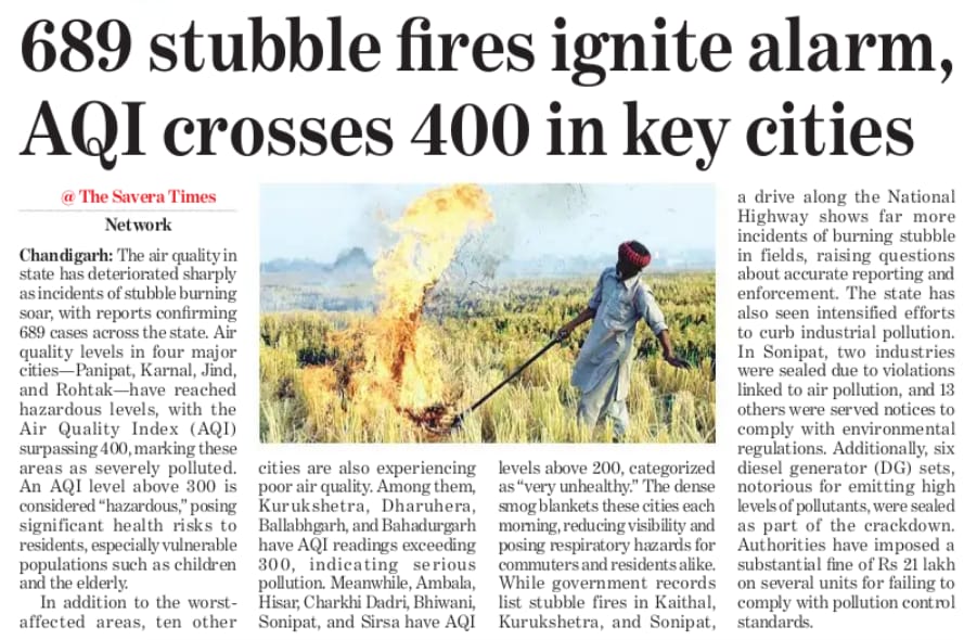 The air quality in Haryana has deteriorated sharply as incidents of stubble burning soar with reports confirming 689 cases across the state. The air quality levels in four major cities — Panipat, Karnal, Jind and Rohtak — have reached hazardous levels with the AQI surpassing 400