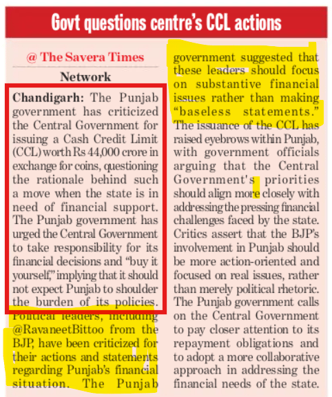 The Punjab government has criticised the Central Government for issuing a Cash Credit Limit worth ₹44,000 crore in exchange for coins, questioning the rationale behind such a move when the state needs financial suppo