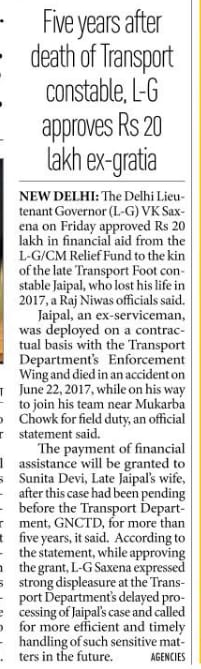FIVE YEARS after the death of a transport constable, the L-G of Delhi APPROVES ₹20 lakh ex-gratia!