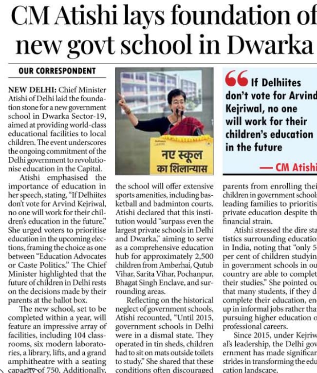 "If Delhiites don't vote for Arvind Kejriwal, no one will work for their children's education in the future." — CM Atishi CM Atishi laid the foundation stone for a new government school in Dwarka Sector-19