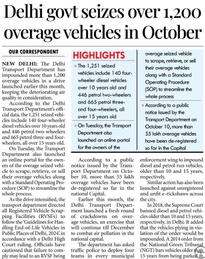 Delhi government seizes 1,251 overage vehicles in October 2024