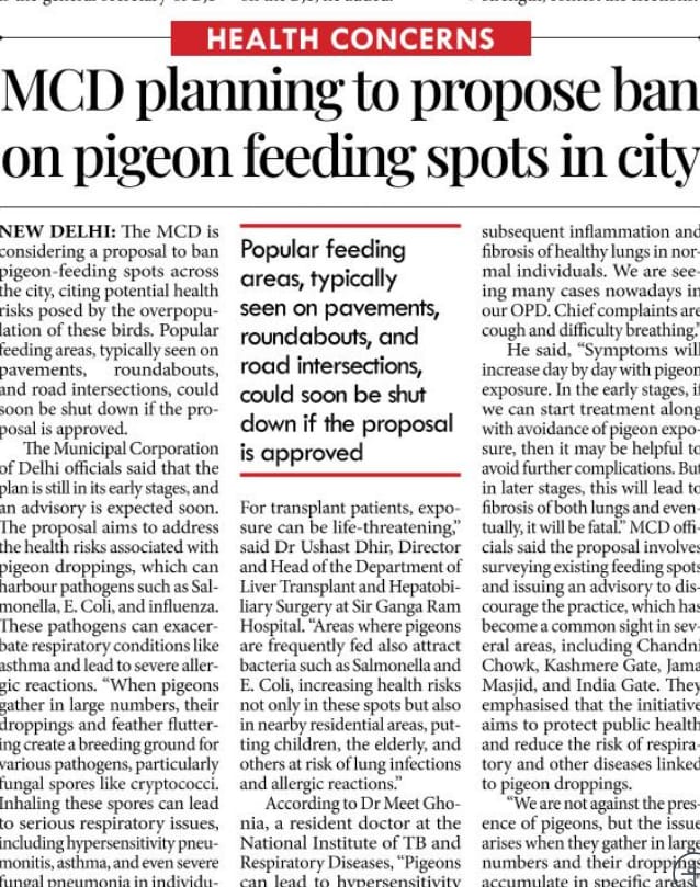 Health concerns — The MCD is planning to propose a ban on pigeon feeding spots in Delhi.