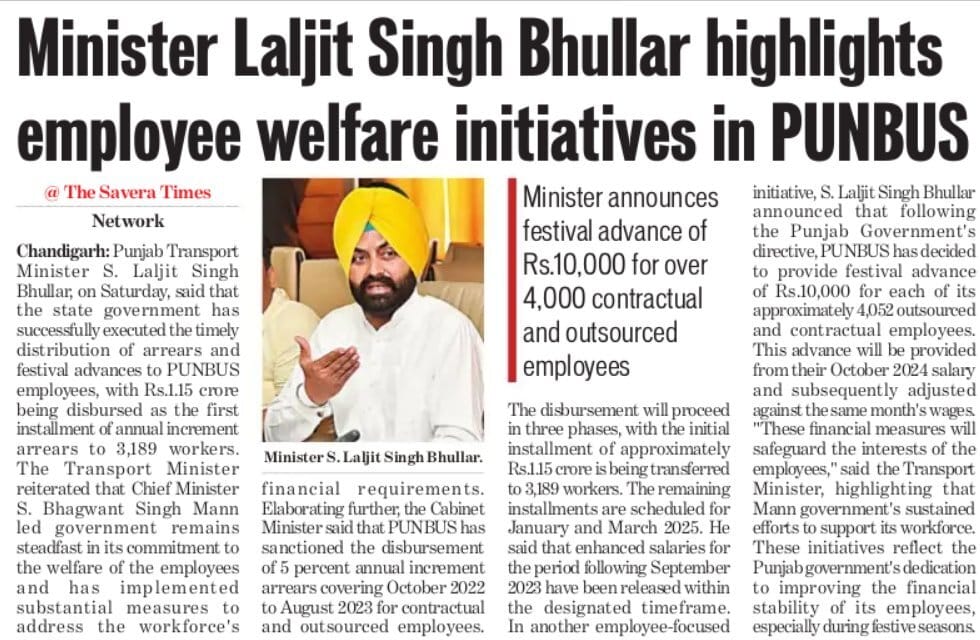 Punjab: Minister Laljit Singh Bhullar highlights employee welfare initiatives in PUNBUS — Festival advance of ₹10,000 for over 4,000 contractual and outsourced employees