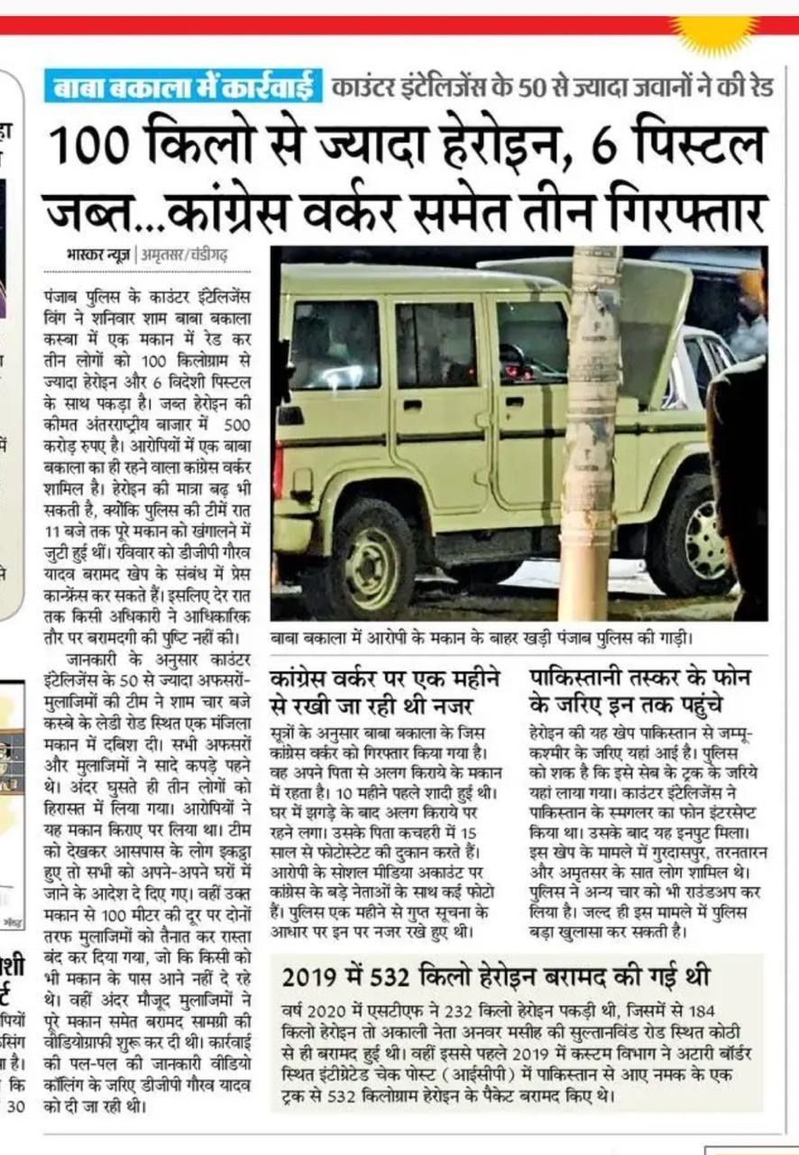 Punjab Congress leader arrested in a major drug bust What does Congress leaders @RajaWirring @PartapBajwa and others have to say about their leader's involvement in the drug trade now? Over 100 kg of heroin valued at ₹500 crore and 6 foreign pistols seized by Punjab Police’s Counter Intelligence.