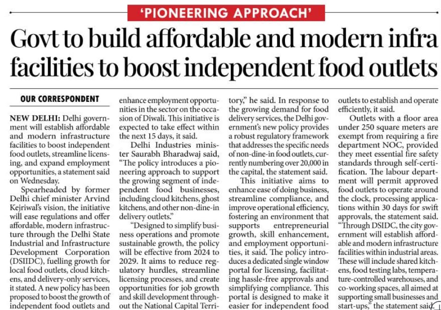 Spearheaded by Arvind Kejriwal's vision, the Delhi government will establish affordable and modern infrastructure facilities to boost independent food outlets, streamline licencing, and expand employment opportunities through the DSIIDC.