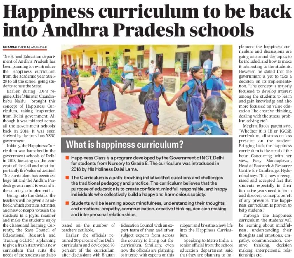 Happiness Class is a program developed by the Government of NCT, Delhi Happiness curriculum to be back into Andhra Pradesh schools