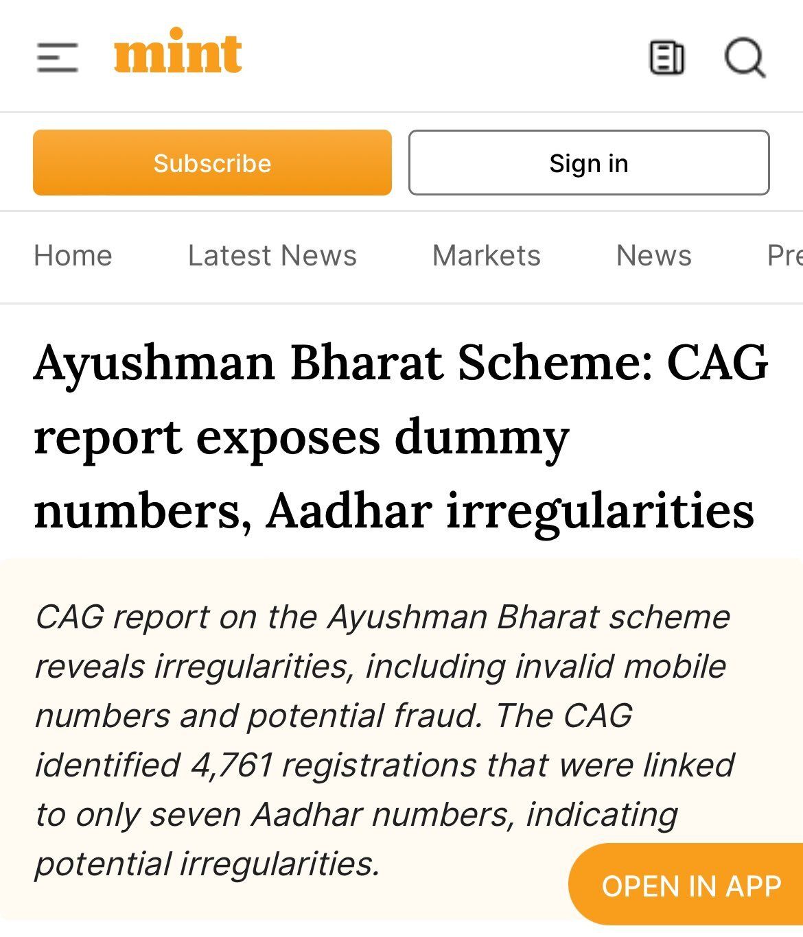 No wonder our beloved prime minister wants to implement Ayushman Bharat Yojana as far and wide as possible. It is as “good” as PM CARES. Around 750,000 beneficiaries were associated with an invalid mobile number, specifically 9999999999. 4,761 enrollments were recorded using only seven Aadhaar numbers in Tamil Nadu. Audit found instances of hospitals that were absent from the list of facilities registered under the public health insurance scheme. In the 2019 report, concerns were raised regarding the absence of publicly accessible data related to the "most conducted surgeries." This raised suspicions that hospitals might engage in fraudulent activities by conducting surgeries that are financially advantageous for them. The report highlights instances where ₹1.1 crore was disbursed for 403 patients who were supposedly deceased,FIT Quint reported.