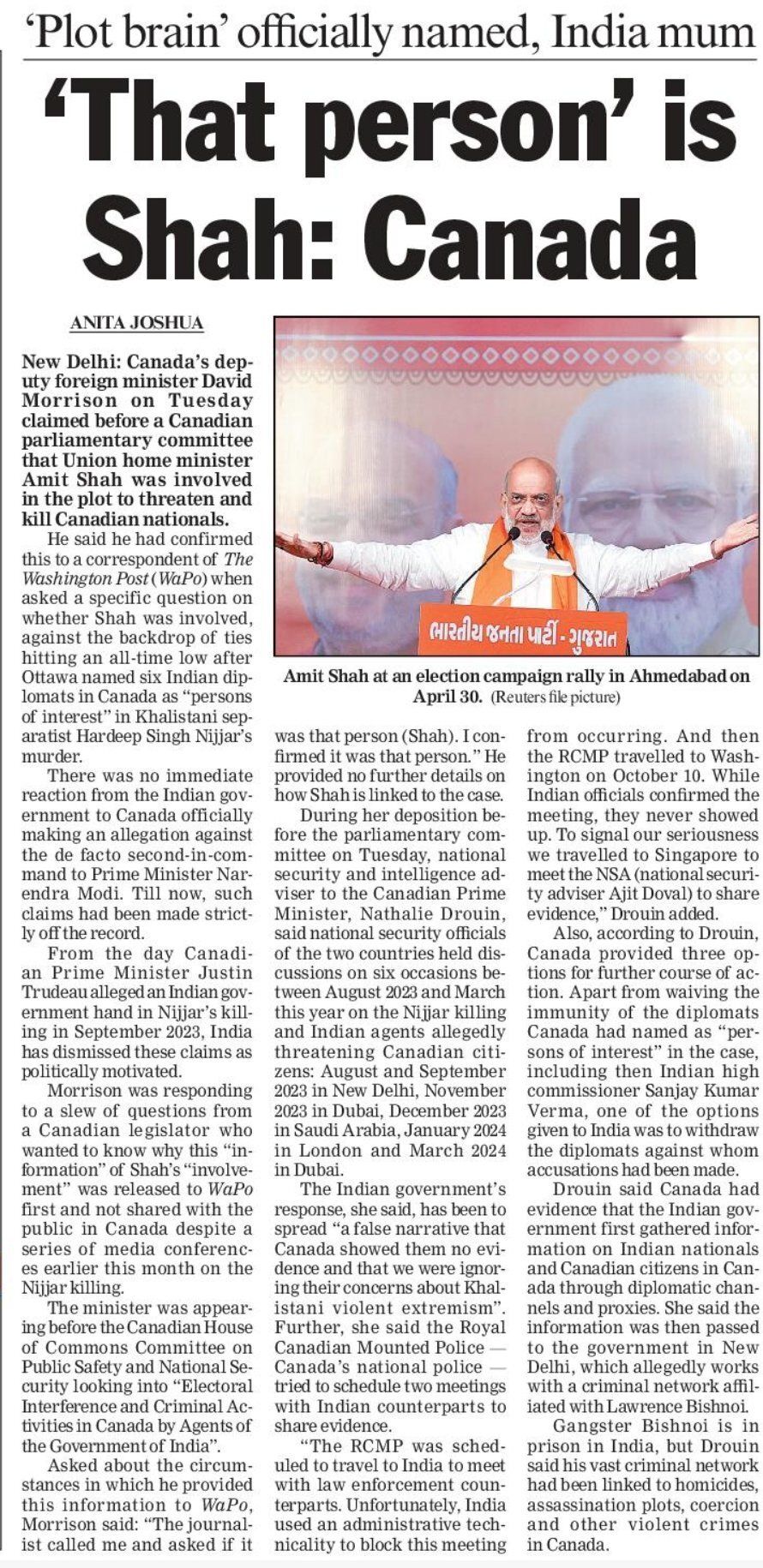 Amit Shah involved in killing of Canadian Nationals Canada Deputy Foreign Minister David Morrison confirms Amit Shah's Alleged Link in Killing of Canadian Nationals . Bishnoi's Name Surfaces The revelation comes after last week's 'Washington Post' report suggesting that Nijjar's murder was part of a wider campaign targeting Indian dissidents abroad.