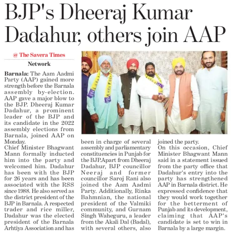 The Aam Aadmi Party gained more strength before the Barnala assembly by-election - BJP's Dheeraj Kumar Dadahur and others joined the AAP.