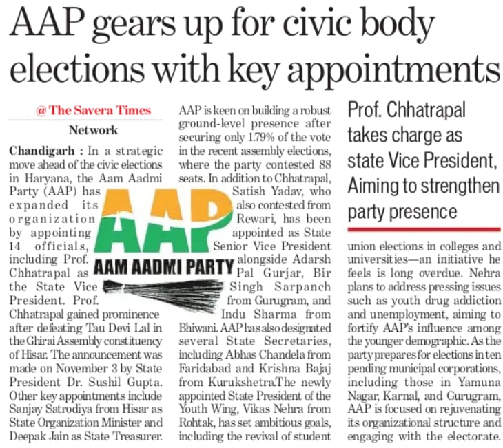 AAP gears up for civic body elections in Haryana with key appointments - Prof Chhatrapal takes charge as state Vice President, aiming to strengthen party presence.