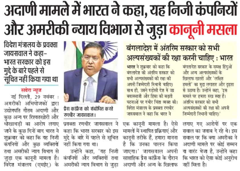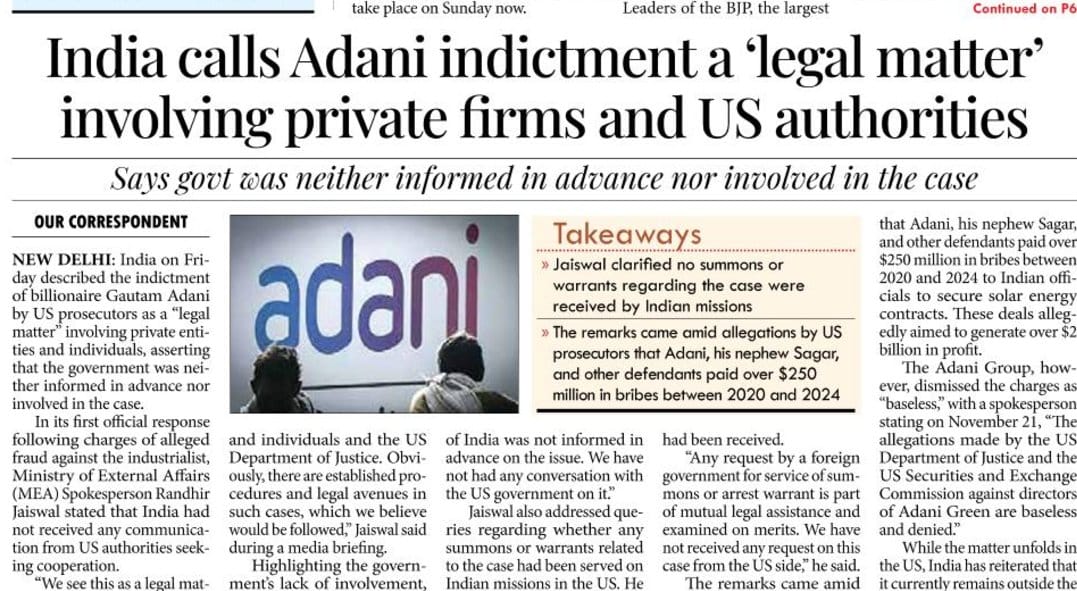 India calls Adani indictment a 'legal matter' involving private firms and US authorities. Says the govt was neither informed in advance nor involved in the case.