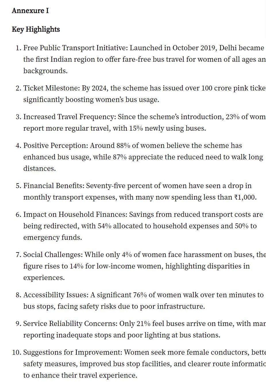 The Scheme allows women to travel fare free in all AC & Non AC buses operated by the Delhi Transport Corporation (DTC) and Delhi Integrated Multimodal Transport System (DIMTS) using a ‘pink ticket’—a single-journey free travel pass.The policy has issued over 100 crore pink tickets as of 2024.