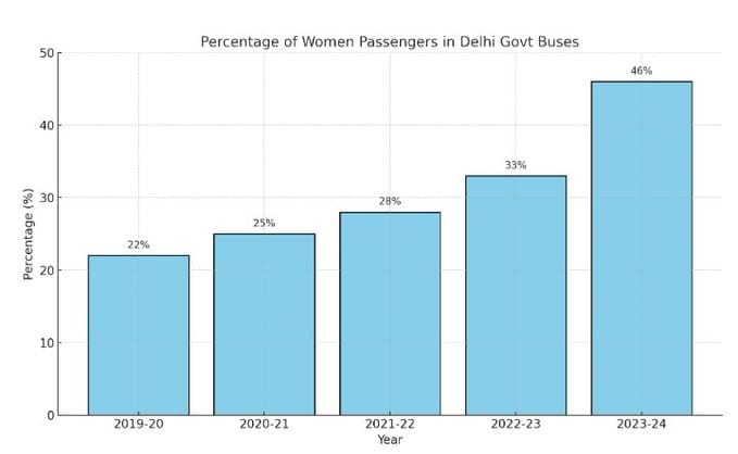 Free Bus Rides for Woman of Delhi has empowered the Women of Delhi The Ridership of Women has doubled in Delhi in last 5 years. In 2019-20 : 22% of total ridership was Women. In 2023-24 : 46% of the total ridership are Women