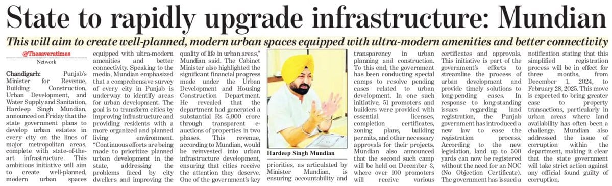 Punjab to rapidly upgrade infrastructure: Mundian This will aim to create well-planned, modern urban spaces equipped with ultra-modern amenities and better connectivity