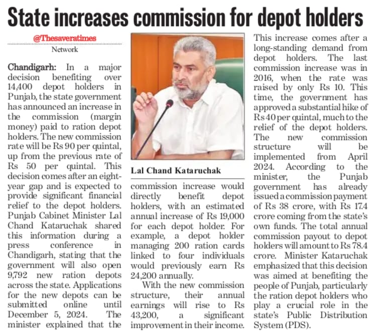 In a major decision benefiting over 14,400 depot holders in Punjab, the state government will increase the commission (margin money) paid to ration depot holders. The new commission rate will be ₹90 per quintal (present rate ₹50)