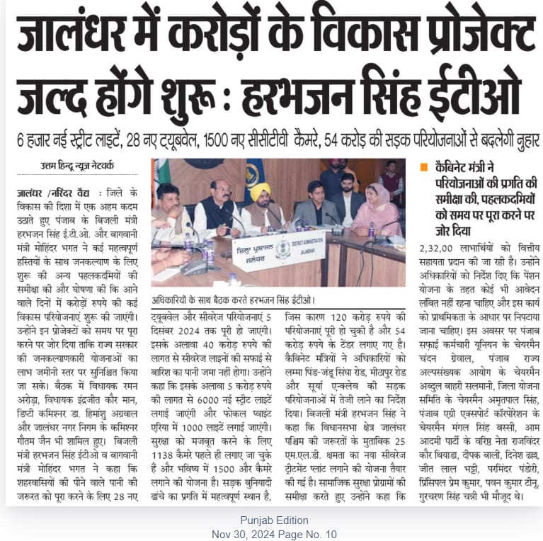Development projects worth crores will start soon in Jalandhar: Harbhajan Singh ETO 6,000 new street lights, 28 new tube wells, 1500 new CCTV cameras, road projects worth Rs 54 crore will change the face of Jalandhar