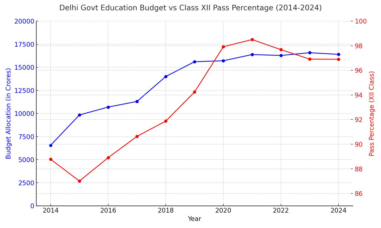 After 2015, Delhi Govt increased Education Budget from 12% to 25% RESULTED in historic high Class 12 Pass Percentage in Delhi Govt Schools. In Red is the pass percentage . Blue is budget allocation. BJP hates the idea of educated electorate. How can they fool the educated with the Politics of division..