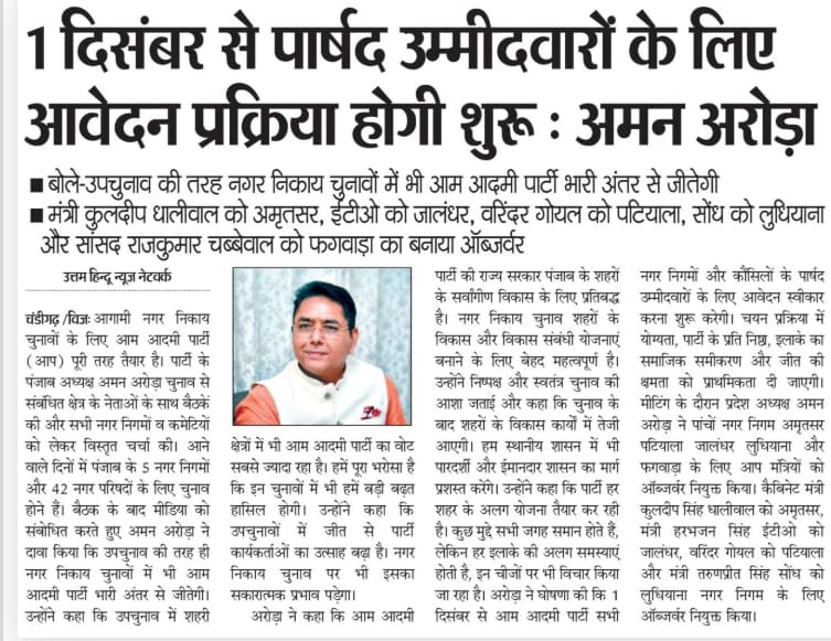 Like Bye-Elections, AAP Poised For a Landslide Victory in MC Polls: Aman Arora Observers are appointed for five municipal corporations — Amritsar, Patiala, Jalandhar, Ludhiana, and Phagwara.