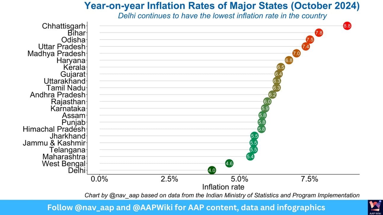#Inflation Latest year-on-year inflation data. Delhi has the LOWEST inflation in India. Thanks to Arvind Kejriwal Model of Governance. Lowest Power Price. No charges on Water Supply. Lowest Fuel Prices among all metros. Subsidized Bus Services. Checks on Private School Fee Hike.
