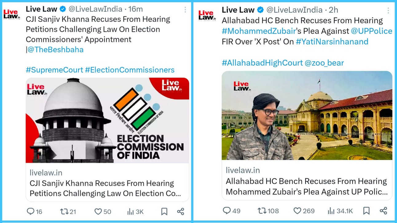 #RECUSES बचाव, उद्घार ⦿ CJI Sanjiv Khanna recuses from hearing petitions challenging law on Election Commissioners' appointment. ⦿ Allahabad HC bench recuses from hearing journalist Mohammed Zubair's plea against UP Police FIR over X post reporting hate speech.