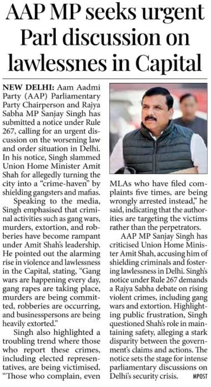 11, Sanjay Singh has submitted notice under Rule 267, calling for an urgent discussion on the worsening law and order situation in Delhi.