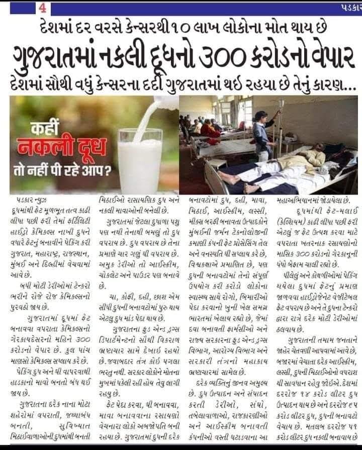 In Gujarat, a fake milk business worth ₹300 crore is operating. Fat is extracted from milk, and fertility hydro chemicals are added to turn the milk into one with higher fat content. This milk is then packaged and sent to Gujarat, Rajasthan, and Maharashtra. The shocking fact is that Gujarat has the highest number of cancer patients in the country.