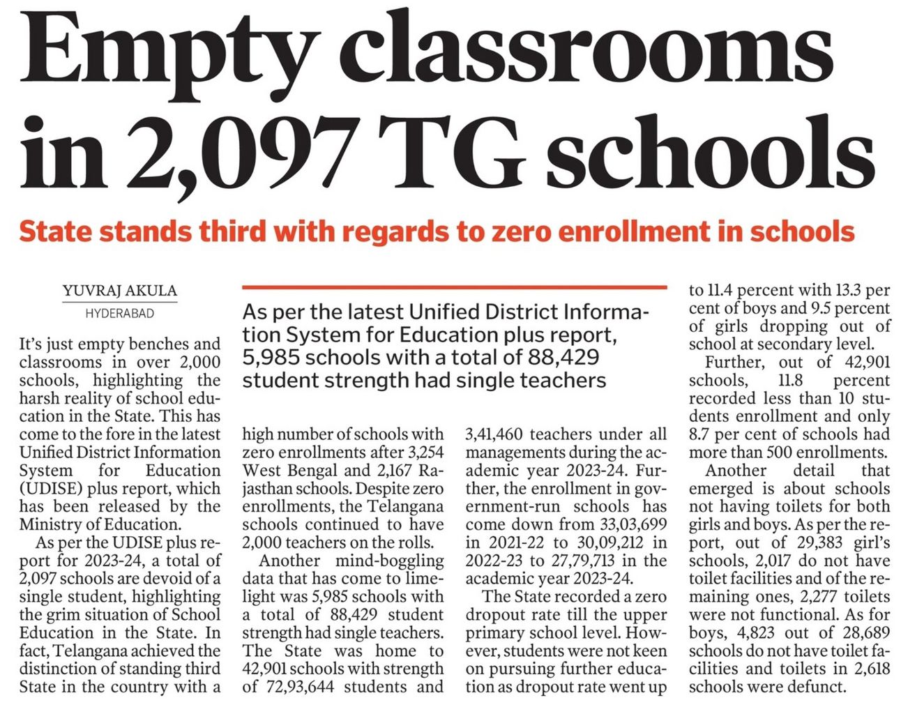 As per the latest Unified District Information System for Education Plus report, 5,985 schools with a total of 88,429 student strength had single teachers West Bengal has 3,254 schools Rajasthan has 2,167 schools Telangana has 2,097 schools with zero enrollment.