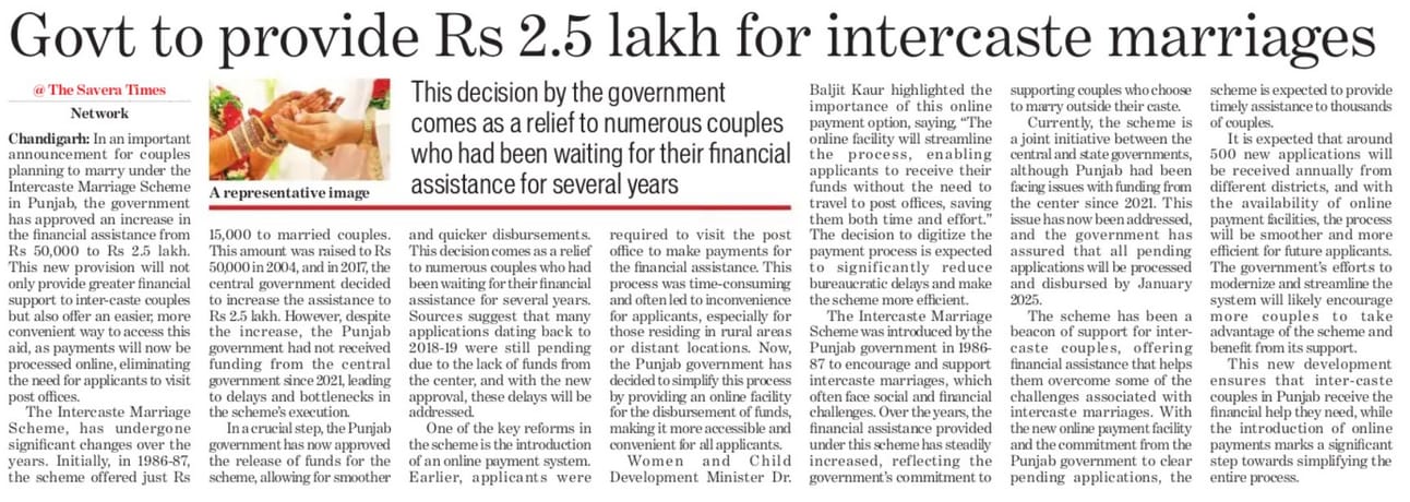 23.In an important announcement for couples planning to marry under the Intercaste Marriage Scheme in Punjab, the government has approved an increase in financial assistance from ₹50,000 to ₹2.5 lakh.The incentive for a legal inter-caste marriage shall be Rs. 2.50 lakh per marriage. On receipt of a Pre-stamped receipt on Rs 10 Non-Judicial Stamp paper. the eligible couples would receive 1.50 lakh of the incentive amount though RTGS / NEFT to the joint bank account. Photo : Legal India, Digital India Registration