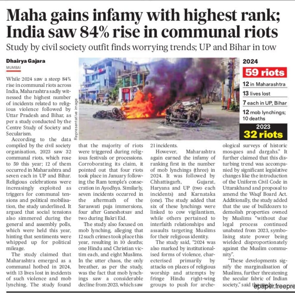 The Law and Order... 2024 saw a steep 84% rise in communal riots across India. Maharashtra witnessed the highest, followed by Uttar Pradesh and Bihar.