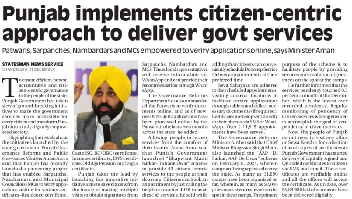 https://x.com/ipathak25/status/1874392087585542572PUNJAB NEWS : Punjab implements Citizen Centric approach to deliver Govt services.