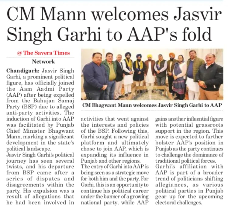 BSP Chief Jasvir Garhi joins AAP in presence of Mann.