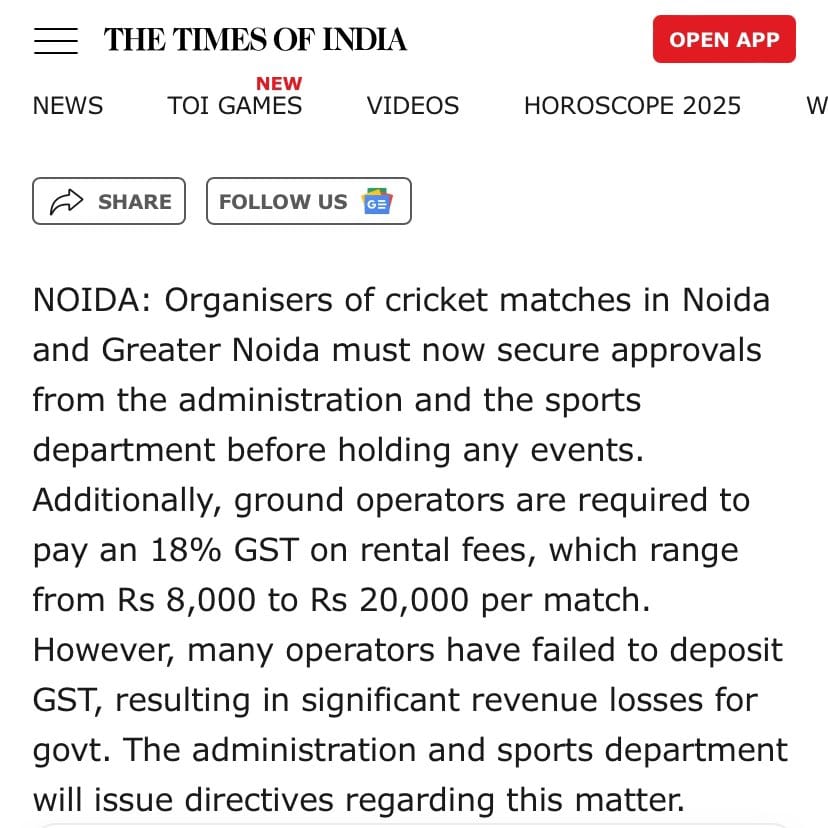 https://www.thehindu.com/education/school-enrolment-down-by-over-1-crore-in-2023-24-says-govt-report/article69050428.eceThere are 500 cricket grounds in Noida and Greater Noida. According to TOI, permission has to be taken from the administration before playing a match here. And yes, 18% GST has to be paid on the rent of the ground.