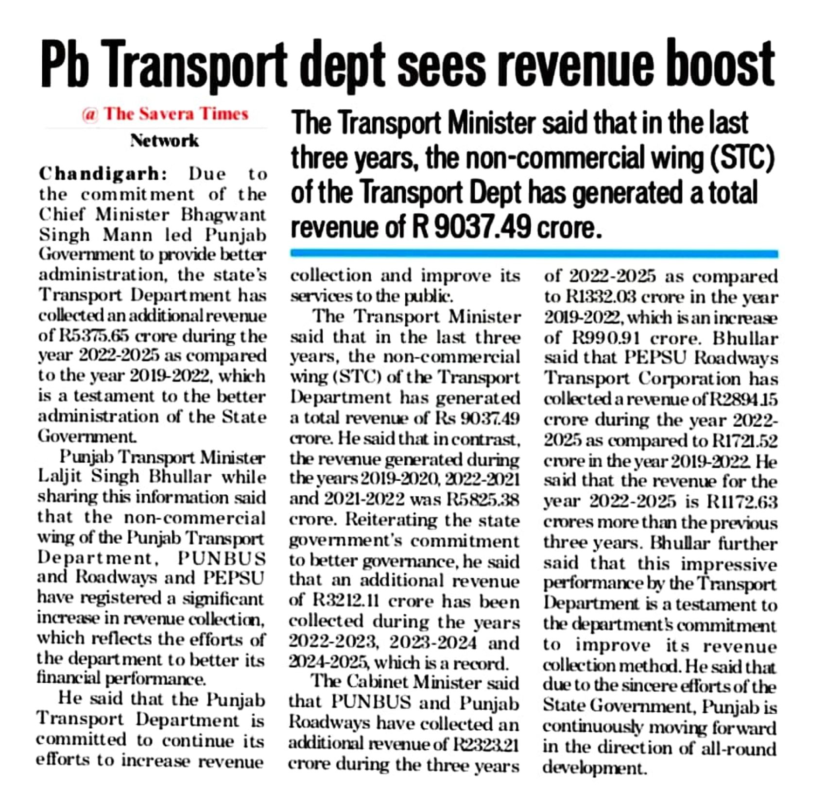 Punjab Transport dept sees revenue boost . Generated a revenue of Rs 9037.49 Crores.