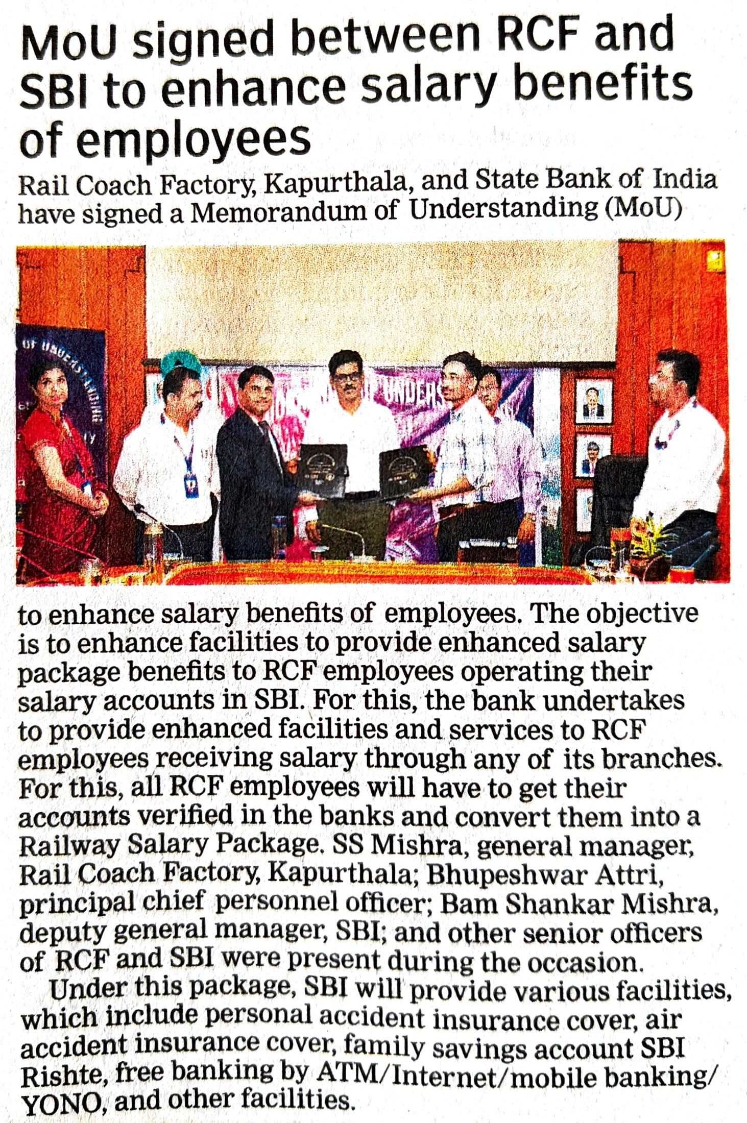 Rail Coach Factory , Kapurthala signed MoU with SBI to enhance salary benefits of employees.