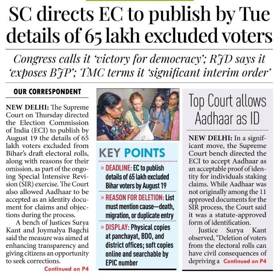 Publish On Website List Of Voters Omitted In Bihar SIR With Reasons; Specify Aadhaar Card Can Be Submitted: Supreme Court Directs ECI.