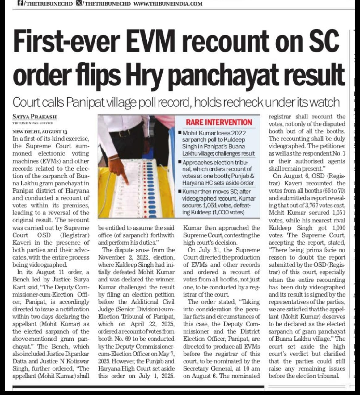 https://x.com/GuptaPragnya/status/1955908995295932694This @thetribunechd exclusive report is damming. On Supreme Court's orders, an EVM result of a Haryana Panchayat election was redone. Shockingly, the earlier result in favour of the sitting Sarpanch was negated. It only shows how people have to be doubly alert to save democracy.