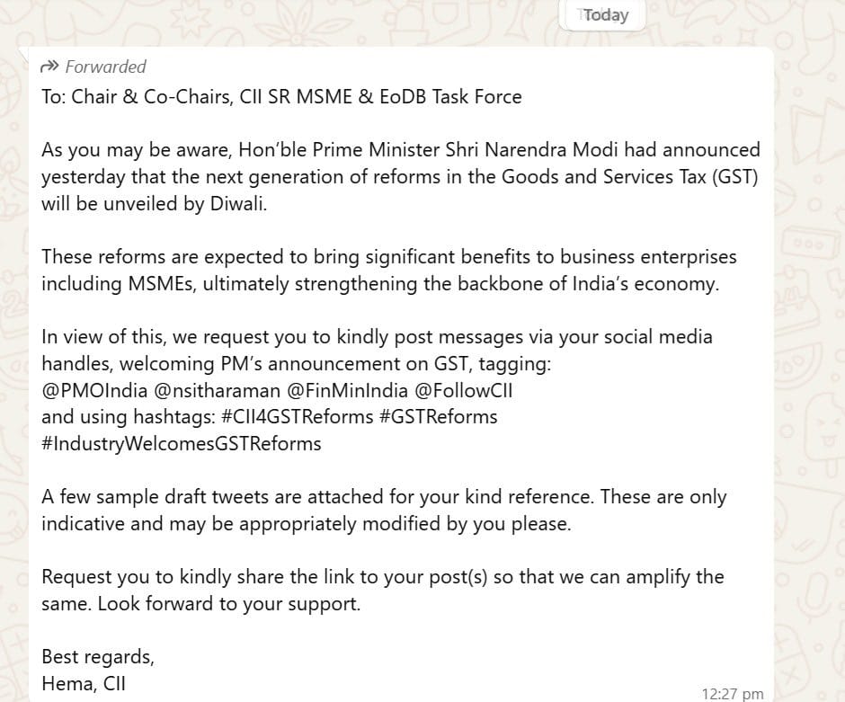 After lauding Modi’s GST for a decade, @FollowCII now asks industrialists to praise Modi for admitting GST was a disaster. They even provide tweet drafts for industrialists to post, with clear instructions on who to tag. Corporates are not so craven & servile even in N.Korea.