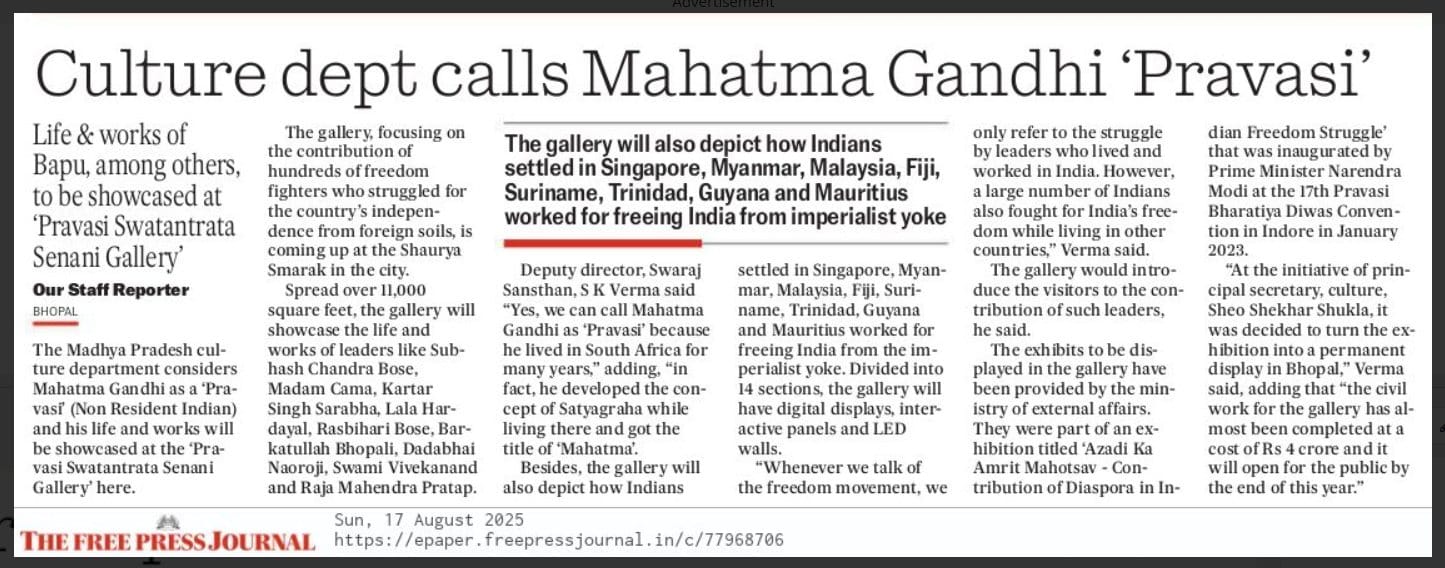 Culture department of Madhya Pradesh government calls Mahatma Gandhi 'Pravasi' (Non-resident Indian)