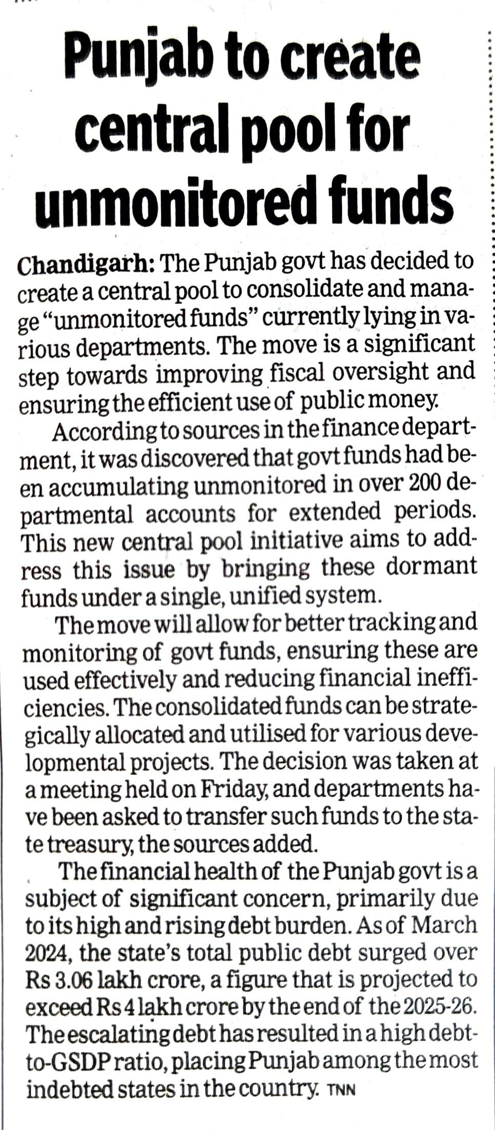 Punjab Govt.m to create Central pool for unmonitored funds.