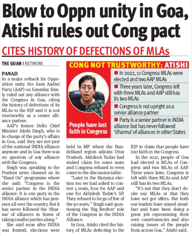 AAP GOA : Congress not trustworthy: Atishi In 2022, 11 Congress MLAs were elected and 2 AAP MLAs. Three years later, Congress is left with 3 MLAs and AAP still has its two MLAs.