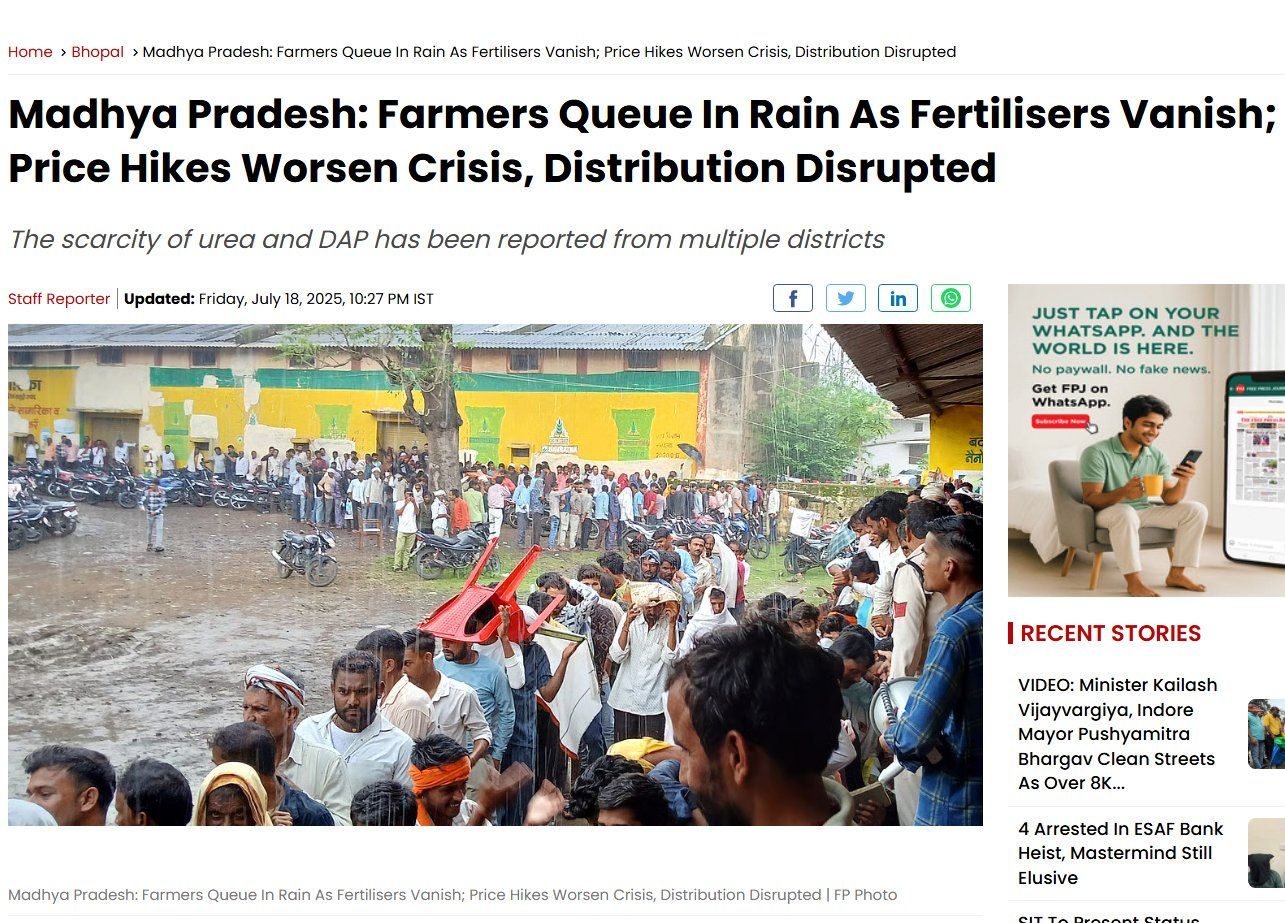 https://x.com/iyer_sk/status/1957364030193954889AAP UP : The condition of farmers in UP is very bad. In Uttar Pradesh, lines are forming for fertilizer bags, and farmers are dying in these lines. But farmers are not able to get fertilizers. We just celebrated independence, but during this time, we must also keep in mind our responsibility towards farmers. Please remember that if our food provider perishes, humanity will vanish from the earth. @SanjayAzadSln