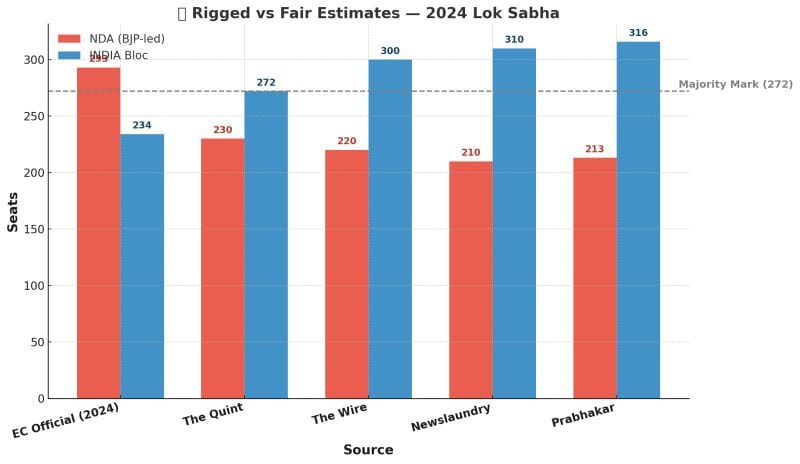 If BJP did not rig the elections, NDA would be at 213 seats & INDIA alliance at 316.” — Economist Parakala Prabhakar.This sounds shocking. But here’s the disturbing part: independent investigations by The Quint, The Wire, and Newslaundry report similar nos- 2024 Lok Sabha: Official vs Independent Estimates EC Official Results: NDA 293 | INDIA 234 The Quint: NDA ~230 | INDIA 272+ The Wire: NDA ~220 | INDIA ~300 Newslaundry: NDA ~210 | INDIA ~310 Prabhakar (Modi Govt Insider): NDA 213 | INDIA 316