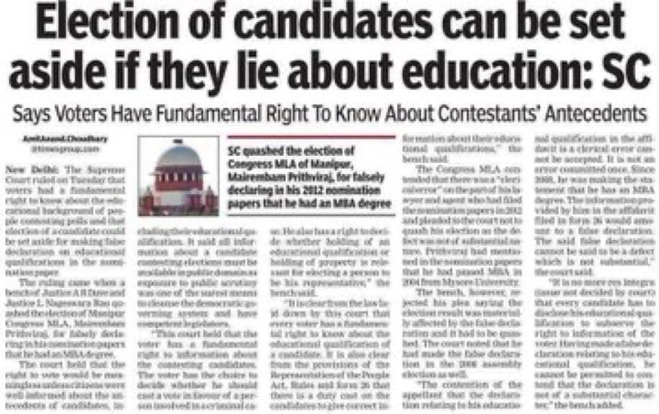 This newspaper clipping is from 2016. “Voters have the fundamental right to know about contestants’ antecedents” Is this why PM Modi is scared of telling about his qualifications?