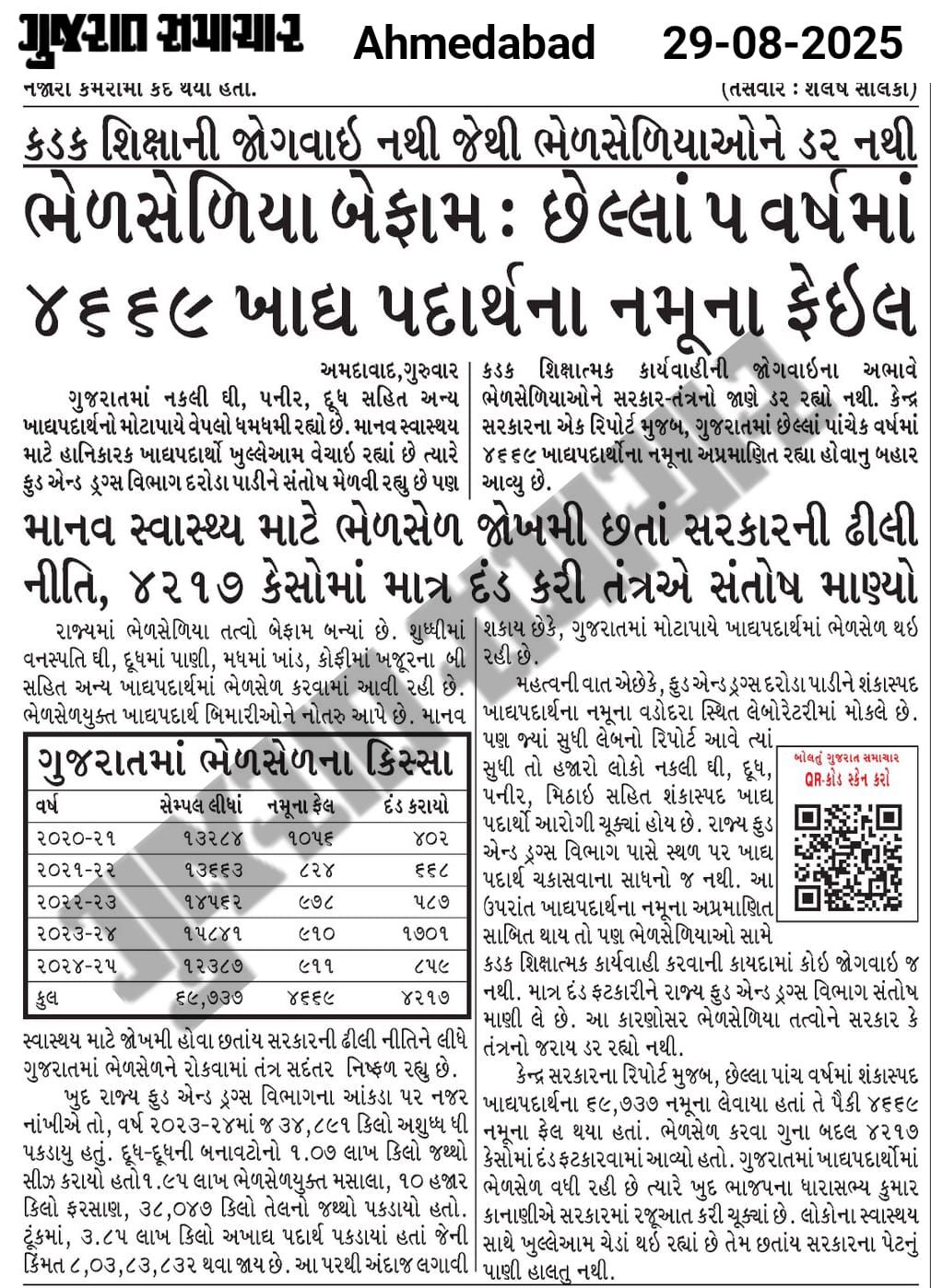 A Central Government report reveals 4,669 food samples failed in the last 5 years, with no strict action taken. In 2023–24 alone, authorities seized 34,891 kg adulterated ghee, 1.95 lakh kg spices, 10,000 kg farsan, and 38,047 kg oil.
