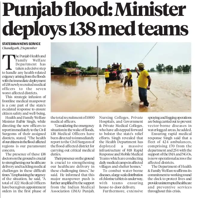 138 newly recruited doctors have been deployed on a 15-day emergency duty in flood-affected areas, even before issuing their formal appointment letters. The appointment letter ceremony has been postponed because of flood relief work.