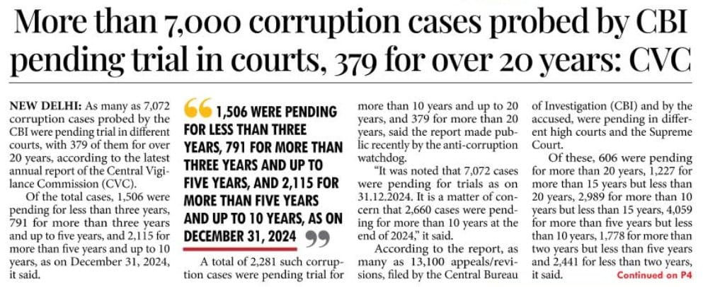 7,072 corruption cases probed by the CBI were pending trial in courts, with 379 of them for over 20 years. As of 31 December 2024, 1,506 were pending for less than three years, 791 for 3-5 years, and 2,115 for 5-10 years.